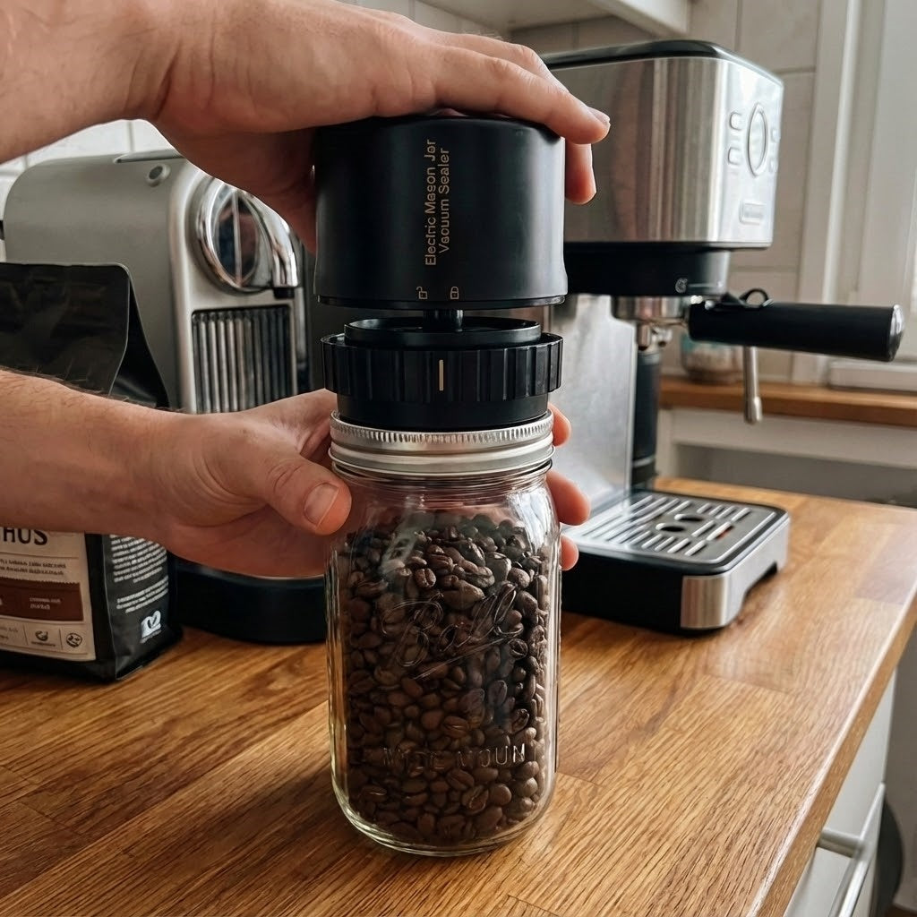 Place the vacuum sealer over the jar lid, press it down firmly, and tap the power button. The process takes about 10 seconds — no manual pumping or pressing needed. The automatic design frees your hands for effortless sealing.